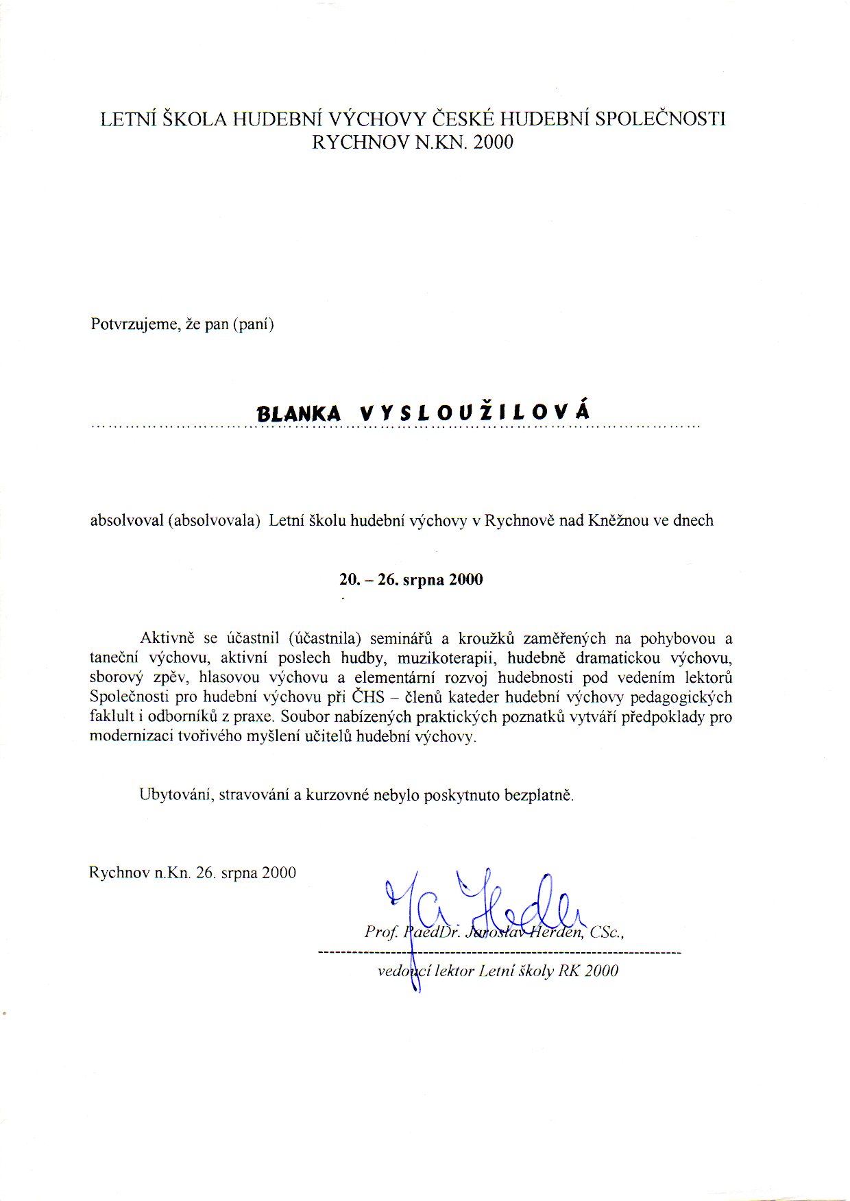 Letní škola hudební výchovy České hudební společnosti, Rychnov nad Kněžnou 2000