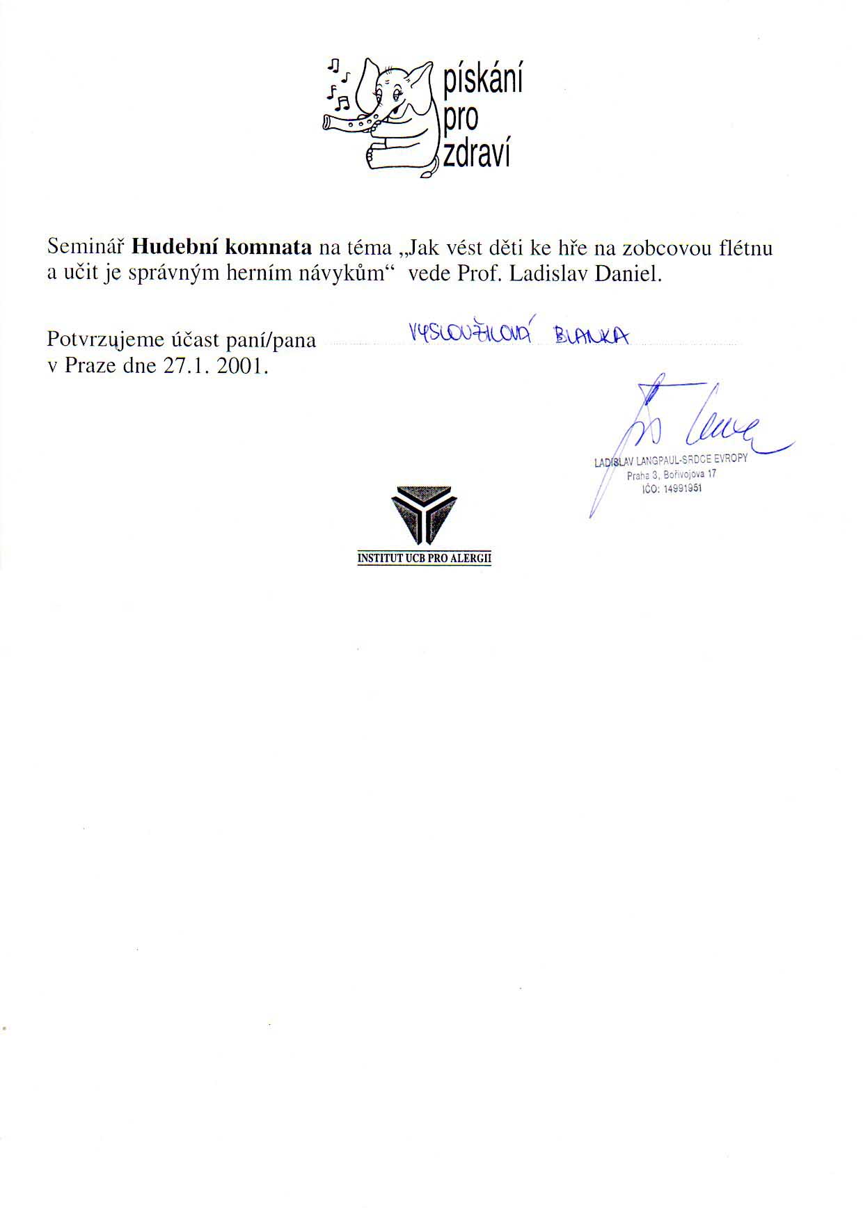 Hudební komnata Institutu UCB pro alergii – prof. Ladislav Daniel, Praha 2001