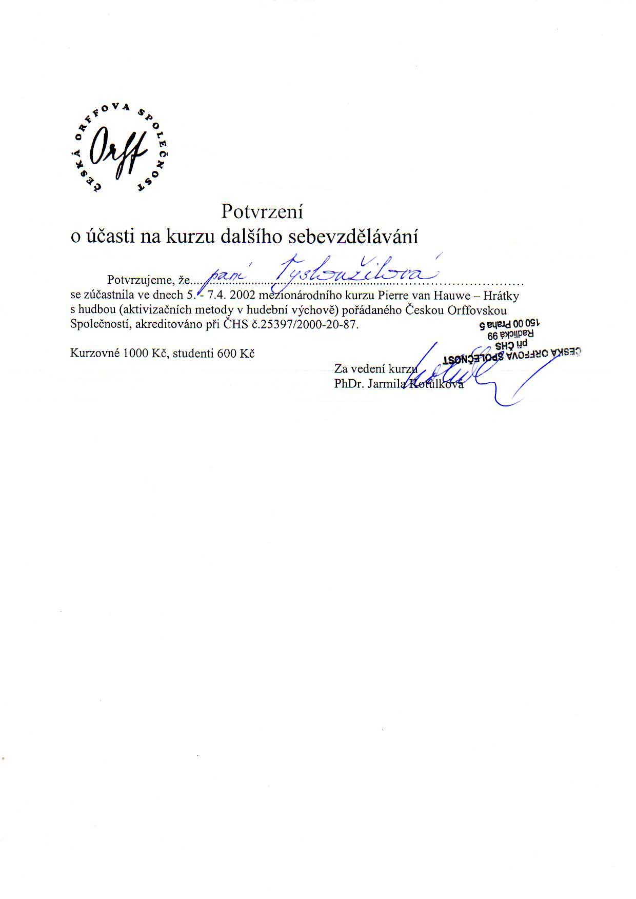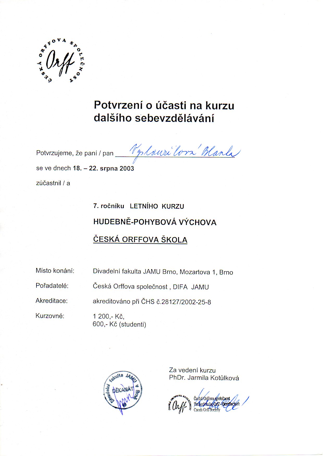 Letní kurz Hudebně-pohybová výchova České Orffovy společnosti, JAMU Brno 2003