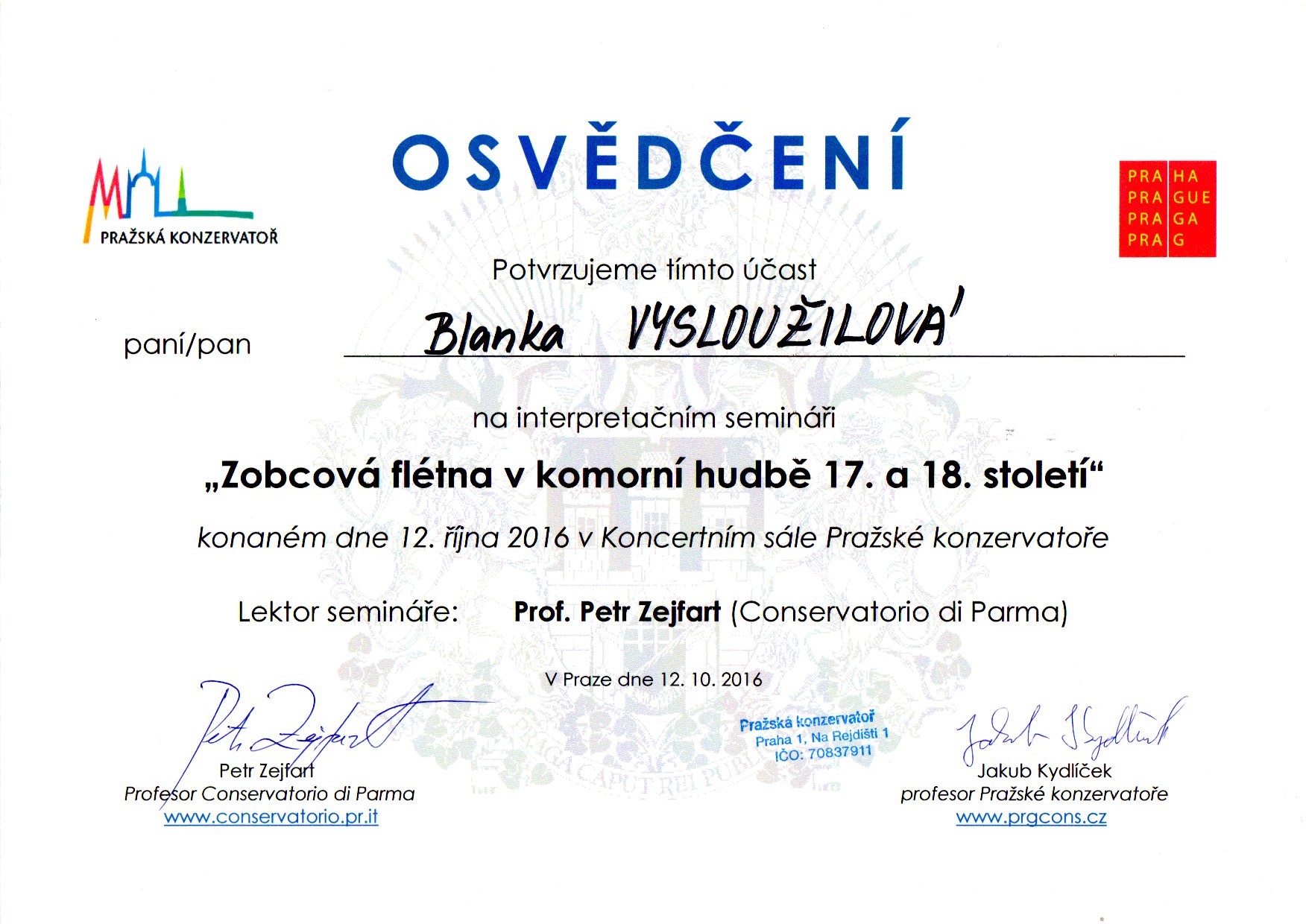 Zobcová flétna v komorní hudbě 17. a 18. století – seminář prof. Petra Zejfarta (Conservatorio di Parma), Pražská konzervatoř, Praha 2016