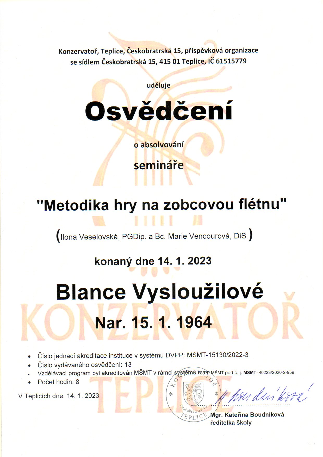 Metodika hry na zobcovou flétnu – Konzervatoř Teplice, Teplice 2023