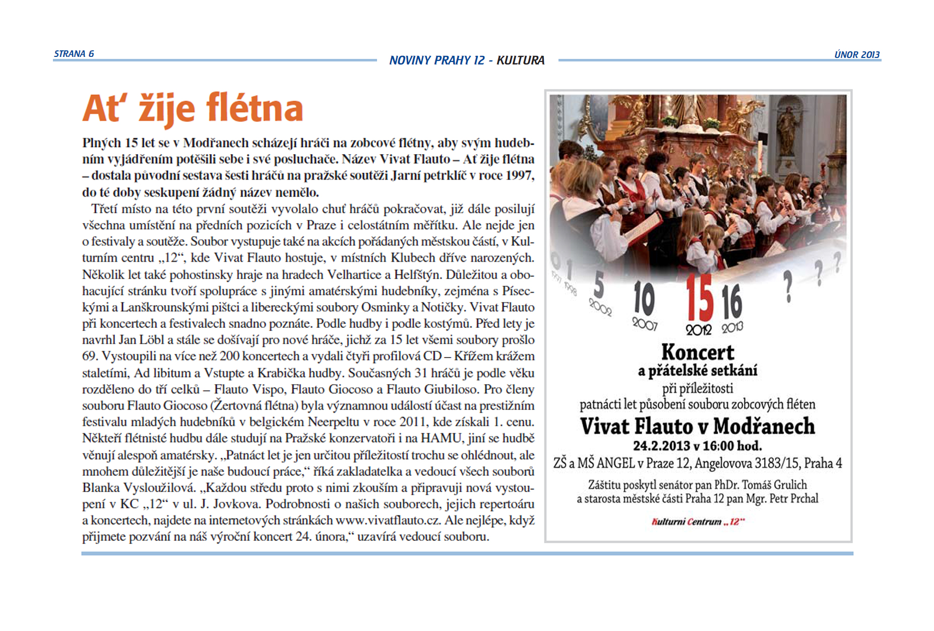 Článek v Novinách Prahy 12 k výročí 15 let působení souboru Vivat Flauto v Modřanech