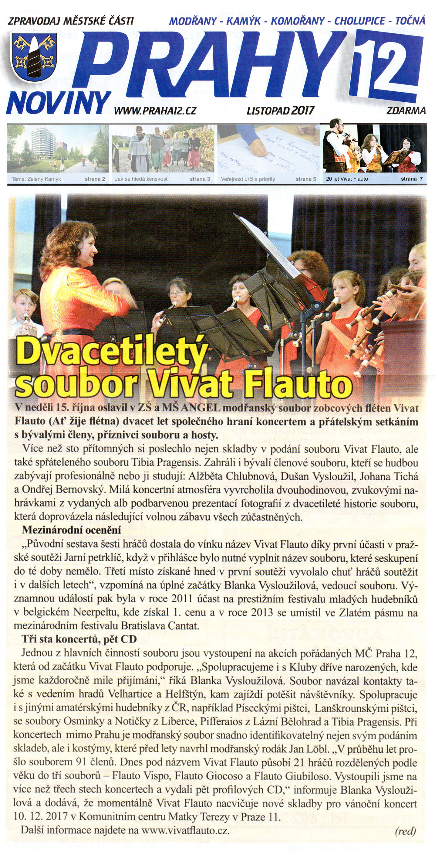 Soubor Vivat Flauto oslavil výročí dvaceti let své existence. Článek o koncertě a přátelském setkání k tomuto výročí, ale také s připomenutím několika nejdůležitějších momentů z historie souboru, vyšel v listopadovém vydání oficiálního zpravodaje městské části Praha 12.