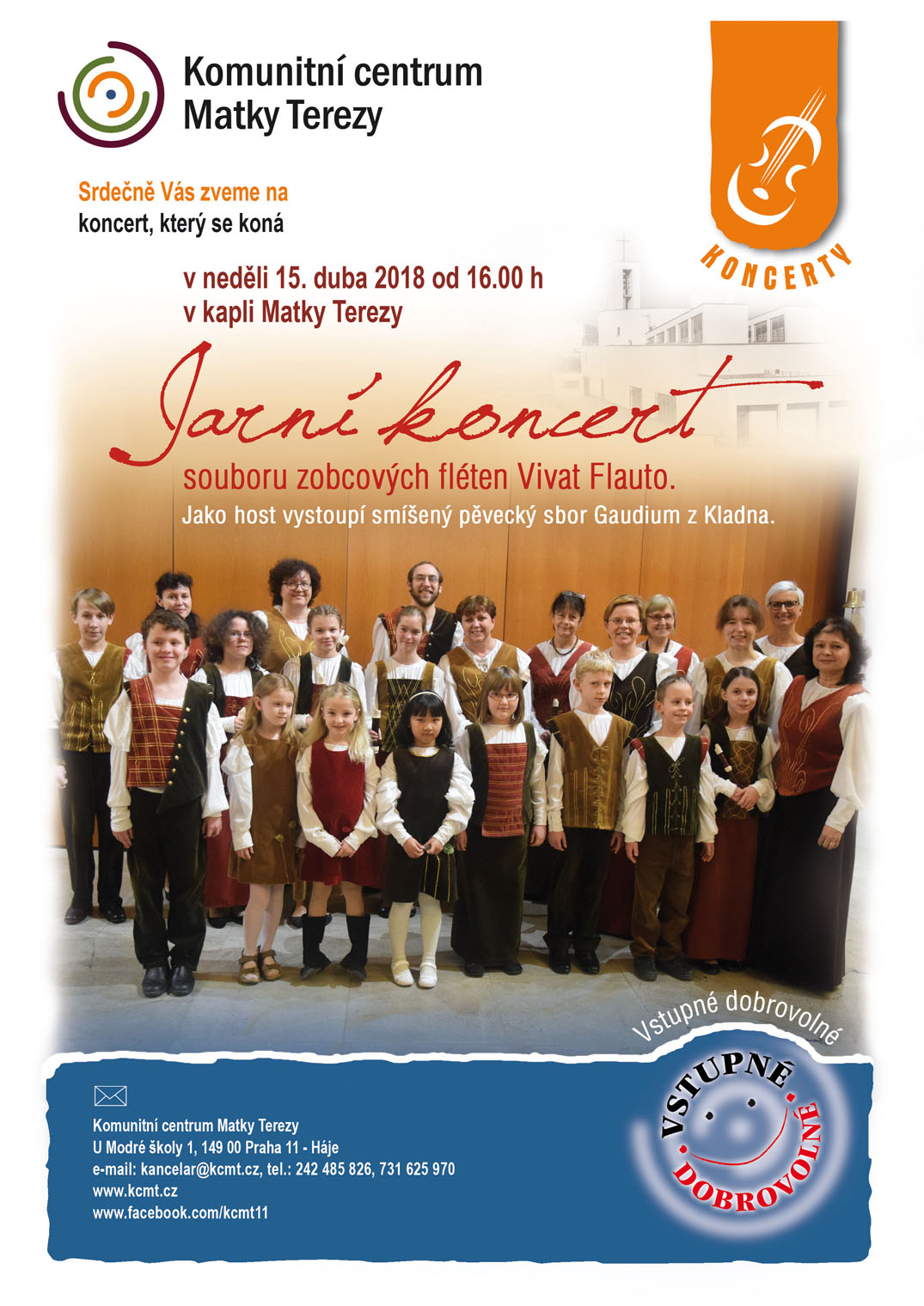 Soubor Vivat Flauto společně se svým hostem, smíšeným pěveckým sborem Gaudium, ZUŠ Kladno, vystoupí v Komunitním centru Matky Terezy na Hájích, Praha 4.