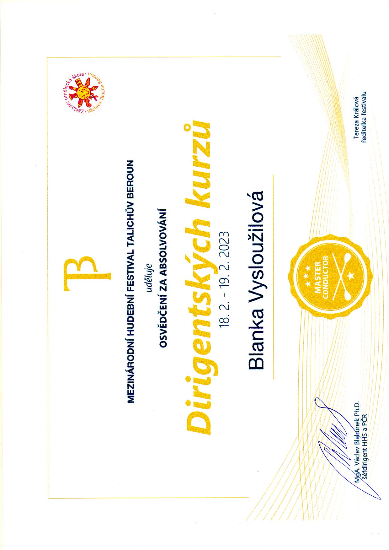 Dirigentské kurzy – vedl MgA. Václav Blahunek, Ph.D., šéfdirigent a ředitel Hudby Hradní stráže a Policie České republiky v rámci Mezinárodního hudebního festivalu Talichův Beroun, Beroun 2023